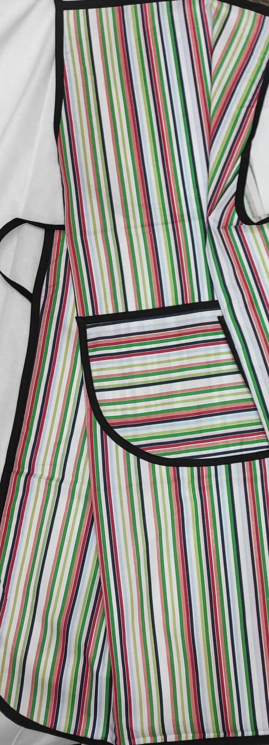 Kuhinjska pregača, pamučna, obrubljena kosom trakom, sa džepom u sredini obrubljenim kosom trakom.